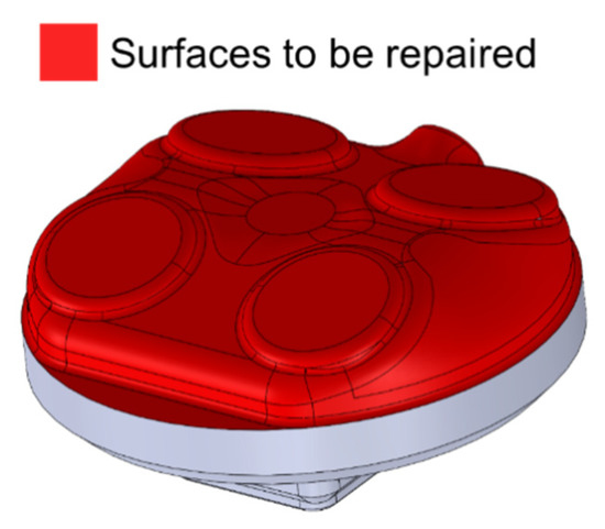 The repairing procedure is composed by three main operations: firstly, the component must be machined in order to remove worn material and, optionally, to obtain a geometry easier to repair; then a layer of fresh material is deposited, and finally the part needs to be machined again for finishing operation. Regards to the first machining phase, called here “preparation phase”, an accurate planning is required to achieve better results in terms of lack of material (usually caused by small recesses and sharp changes in the surface of the part). This allows us to avoid the cited sharp corners, recesses and abrupt changes in the surface that are usually hard to fill by the new layer causing quality defects in the part. An example of how the surface has been smoothed on the test case is reported in Figure 8. The machining phase has been carried out in two steps: one for roughing using a 3 flutes 10 mm end mill tool from NS tools (code MSE345 with cutting speed of 60 m/min, feed speed of 300 mm/min, depth of cut of 2 mm and radial engagement of 0.5 mm), and one for the finishing using a 4 mm ball end mill from NS Tools (code MACH225SF with cutting speed of 60 m/min, feed speed of 1200 mm/min, depth of cut of 0.2 mm and radial engagement of 0.7 mm).