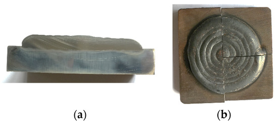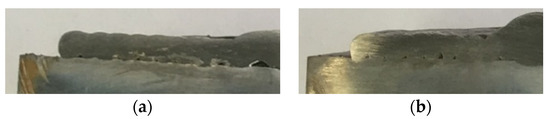 The best results in terms of quality of the deposited layer has been achieved with wire speed of 5 m/min, deposition speed of 360 mm/min and dynamic correction of −2.5. The result of this setup is reported in Figure 6, where a fully dense layer with enough penetration depth could be appreciated. A couple of examples of not satisfactory setup are shown in Figure 7. The first case is related to a wire speed of 3 m/min, deposition speed of 360 mm/min with zero dynamic correction, while the second the travel speed has been lowered to 300 mm/min. In both cases, it is possible to evaluate how the depth of penetration is too low and some voids are visible at the base of the beads. In the process with the lower heat input, in the first, these voids are quite evident and there is a nearly complete lack of fusion of the substrate. The second sample has a higher heat input and the presence of voids and reduced fusion of the substrate, although present, are less evident. To achieve a good penetration and remove the voids at the base of the beads has been necessary to increase the heat input of the process, mainly increasing the wire speed and introducing an arc correction. The negative arc correction has the effect to increase the arc voltage. Too high correction is responsible for spatter and should be avoided.