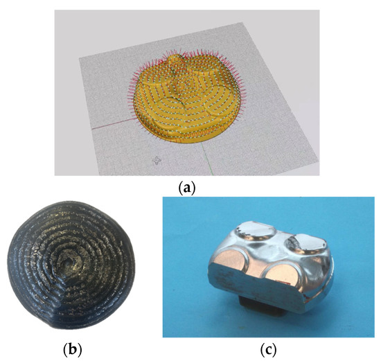 (a) Developed toolpath for surface cladding; (b) top view of the deposited repairing layer; and (c) section of the part repaired after machining.
