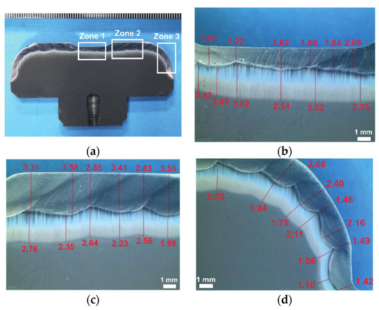 (a) Analysis of the depth of penetration of the repaired part; thickness of the deposited layer and HAZ in (b) zone 1, (c) in zone 2, and (d) in zone 3.