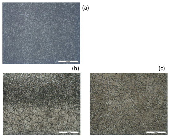 Metallographic analysis of (a) base metal, with tempered martensite; (b) HAZ, with needles of martensite; and (c) deposited layer, with needles of martensite and segregated zones.