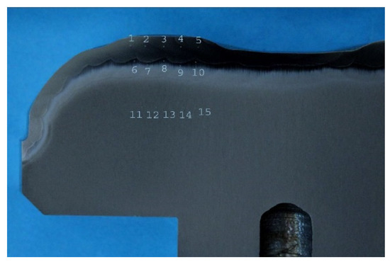 Vickers HV10 hardness tests have been carried out to evaluate the need for additional heat treatment after the repairing using a Shimadzu HMV 2000 microhardness test equipment. The results of the tests are reported in Table 3, while the locations of the tests are presented in Figure 12. The hardness measured in the overlay and in the HAZ is higher than required; the mean value is around 660 HV, while an acceptable value for the specific application is 560 HV. A following heat treatment is required to reduce the hardness of the overlay to an acceptable level.