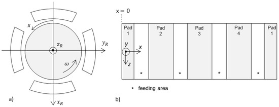 Coordinate system of (a) the rotor and (b) the lubricant gap on example of a 4-tilting-pad bearing.