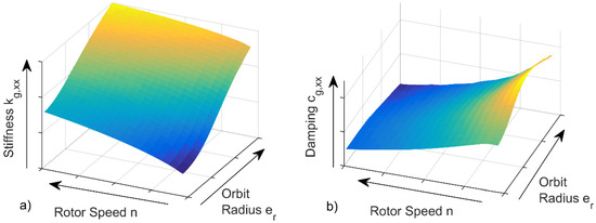 The global stiffness in direction of journal orbit radius and the main damping in direction of tangential orbit velocity are calculated according to Equation (10):