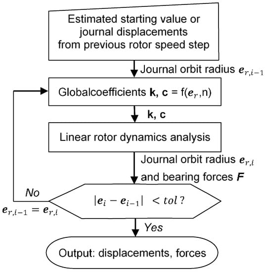 Global coefficients can easily be used in rotor dynamic analyses by updating the coefficients with a bearing orbit as demonstrated in Figure 5. The coefficients are iteratively adjusted until the change in the journal orbit radius satisfies a criterion of convergence. In the following, this procedure is referred to as quasilinear analysis (QLIN). It is recommended to use the solution of the last operating point as the initial condition of the next speed step to enable a path tracing in the simulation.