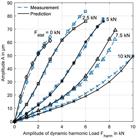 Figure 6 compares measured [26] and non-linearly (NLIN) predicted amplitudes for different static and dynamic loads. The load is directed between the pads and has a static part and a dynamic, harmonic part . Thus, the total force amounts to . Measurement and prediction match very well, both in general characteristic and in absolute values.