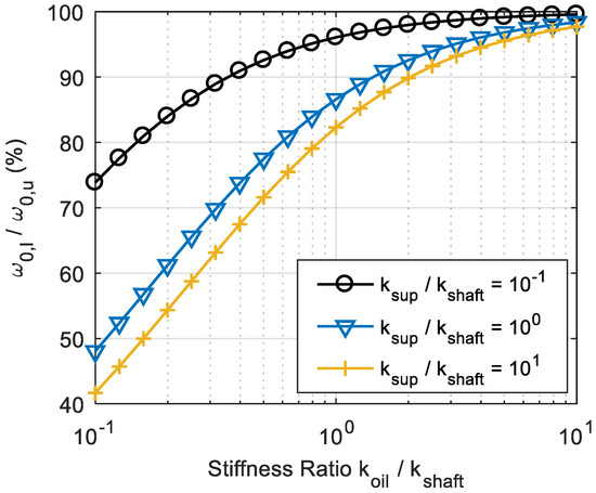 Its solution is depicted in Figure 8 and depends on the both stiffness ratios: and . The resonance ratio is independent of the rotor mass. The curves in Figure 8 show the shift of resonance with oil film stiffness (<100%) to the upper resonance (=100%). A non-linear analysis should be considered for a low ratio of and a high ratio of due to a high possible shift of the resonance speed.