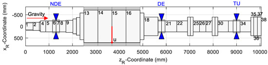 The rotor model of the investigated fictitious hydro unit is depicted in horizontal representation in Figure 9. The active generator length extends over the sections 13 to 16 and the turbine is located in sections 35 to 37. An unbalance is placed in the middle of the generator on node 15.