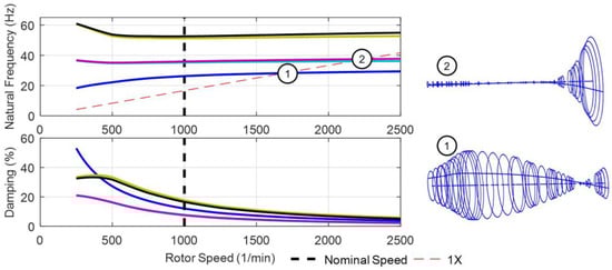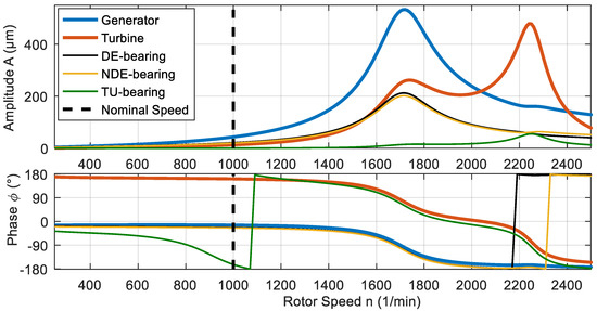 In the first instance, all investigations are carried out using the variant 1 bearing. Figure 10 depicts the natural frequencies and their damping in a Campbell diagram. The stiffness and damping of the bearing center are used. While the bearing stiffness increases with rotor speed, the damping decreases. The modifications are most significant at low speeds. Therefore, the eigenvalues also change predominantly in the low speed range. The first critical speed is located at . Figure 10 additionally shows the shape forms of the eigenfrequencies for the first and second critical speeds. The shape of the first eigenvalue indicates that it can be excited by an unbalance located at the generator, whereas the second eigenvalue is particularly excited by a turbine unbalance. The second critical speed is reached at . Since the machine operates in the subcritical regime, the first critical speed is of practical importance. For these reasons, an unbalance located at the generator (node 15) is assumed. To study the influence of the unbalance, the balance quality grade G6.3 is used as reference, which leads to an unbalance of . The particular unbalance is specified as a percentage value of the G6.3 unbalance. Eigenvalues change at low speeds.