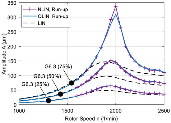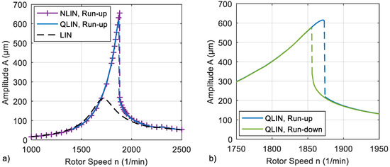 Figure 12a compares the generator amplitudes of the linear (LIN) and non-linear solution for the unbalance G6.3 (40%) and the variant 1 bearings in a run-up simulation. For verification purposes, the nonlinear (NLIN) solution and the quasi-linear (QLIN) solution are depicted. A very good approximation quality of the quasi-linear analysis can be determined. The resonance speed increases from n = 1720 1/min to n = 1880 1/min compared to the linear analysis. Amplitudes are much higher than in the linear solution. After passing the resonance speed the amplitude “jumps” in the supercritical regime with low level amplitudes. The dashed line marks the path of the jump. In Figure 12b the behavior of the run-up and the run-down can be seen. Between the run-up and the run-down a hysteresis can be observed. Coming from the supercritical regime, the resonance speed for the run-down is lower than the resonance speed for the run-up because the bearings are less stiff at smaller amplitudes. A hysteresis only occurs when the unbalance is sufficiently large.