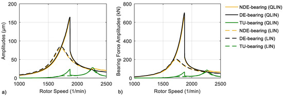 (a) Relative bearing amplitudes; (b) amplitudes of bearing forces; each for the linear (LIN) and quasi-linear (QLIN) analysis, unbalance G6.3 (40%), variant 1, run-up.