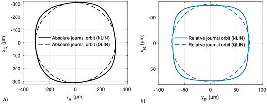 Absolute and relative journal orbits at the maximum resonance amplification and maximum examined unbalance are depicted in Figure 17. As expected, the non-linear calculation deviates from the circular orbit and fits the journal movability curve of the four pads. Quasilinear analysis predicts a relative journal orbit that is alternately slightly larger or smaller. Overall, the approximation quality proves to be very accurate.