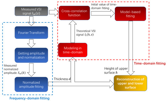 In this method, the film thickness is calculated by frequency-domain fitting, and the height of the upper surface of the film is obtained by time-domain fitting. The height of the lower surface can be calculated by subtracting the thickness of the film from the height of the upper surface . The topography of the film is reconstructed by this process. The flowchart of the proposed method is shown in Figure 2.
