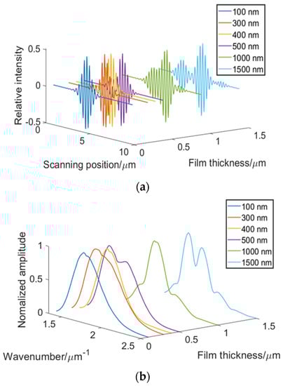 The frequency-domain analysis of the interference signal was illustrated by simulation. In Figure 3a, Equation (4) was used to simulate the VSI signal of a thin SiO2 film deposited on a silicon substrate with different film thicknesses of 100, 300, 400, 500, 1000, and 1500 nm, and the scanning step was 30 nm. The white-light source was set as a Gaussian light source (full width at half maximum, 140 nm; central wavelength, 580 nm). Assuming that the light intensity ratio of the two beams which the white light source is split into by a beam splitter is 1:1, for the visible light, the reflectivity of the reference mirror can be regarded as 1. Figure 3b shows that the normalized amplitudes differed obviously with different film thicknesses.