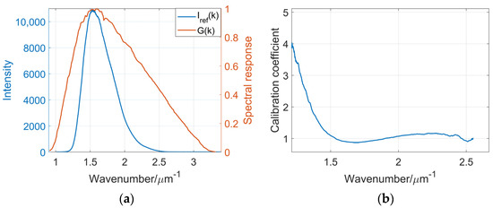 Before measurement, the system parameters in Equations (3) and (4) must be calibrated. First, the spectrum of the light reflected from the reference mirror (corresponding to in Equation (3)) was measured by a spectrometer (QE Pro; Ocean Optics, Dunedin, USA) when the measuring optical path is blocked, and the spectral response of the camera (corresponding to in Equation (4)) was obtained from the camera’s manual; these are shown in Figure 6a.