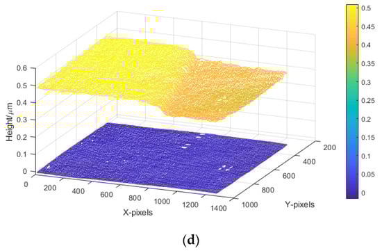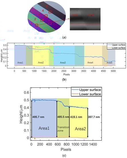 For the stepped film, at the junctions between areas of different thicknesses, the film was not as uniform as in other areas. There was a stepped height area on the upper surface, and the lower surface was a silicon plane. Thus, we proceeded to reconstruct the upper and lower surfaces of the region of interest by the time-domain fitting method. The cross-sectional morphologies of the junctions of different thicknesses shown in the red squares in Figure 8a were spliced together in Figure 8b, and more details of the junction between areas 1 and 2 (the red line in Figure 8a) are shown in Figure 8c. Because of the high lateral resolution of the full-field-of-view measurement, we can observe the transition of the surface topography at the junction. The range of the film thickness was approximately 400–500 nm, and the maximum and minimum thicknesses of the transition zone were 485.8 and 419.1 nm, respectively. As shown in Figure 8d, pixels in lines 310–1000 were selected for 3D surface topography reconstruction. The lower surface of the reconstructed film was almost a plane, which proved the accuracy of the height obtained by the time-domain fitting.
