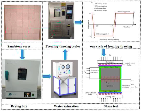 Many experiments have been carried out to study the effects of freezing–thawing cycles on the physical/mechanical properties of rock [16,17,18,19,20,21]. The investigated properties include density, porosity, P-wave velocity, point load strength, elastic modulus, Poisson’s ratio, and uniaxial compression strength (UCS). These studies were mainly carried out in the context of static or quasi-static loading conditions [22,23,24,25,26,27,28,29,30]. Most tri-axial unloading tests were used to study the influences of the unloading path on rock deformation, strength, and energy evolution after a freezing–thawing cycle [31,32,33,34,35,36,37,38]. However, the tri-axial unloading test cannot directly and effectively simulate the shear failure mechanism of rock that has suffered only from unloading normal stress. Therefore, it is necessary to understand the shear mechanical behavior of rocks under unloading normal stress.