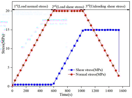 The stress path of the DSTUNS is shown in Figure 2. According to the results of the direct shear test, the preset shear stress was 15 MPa, and the normal stress was 20 MPa. Based on this, the normal stress was loaded to the predetermined value of 20 MPa at a rate of 2 MPa/min. Then, the shear stress was loaded to the predetermined value of 15 MPa at the same rate.