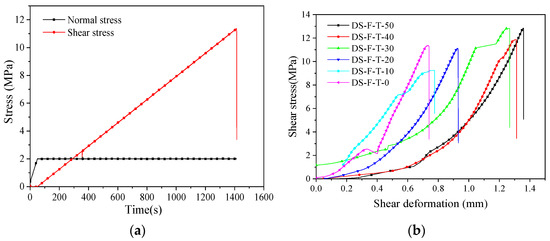 The direct shear tests of samples after different freezing–thawing cycles (0, 10, 20, 30, 40, and 50 times) were carried out at normal temperature (25 °C). First, 2 MPa normal stress was applied to the sample at a speed of 2 MPa/min. At the same time, the normal stress was kept constant and the shear stress was applied to the samples at a speed of 0.5 MPa/min until the sample was broken, and the failure stress was obtained when the samples were broken. The set values of 20 and 15 MPa for the shear stress and the normal stress were obtained for the DSTUNS. The stress path of the direct shear test on the untreated freezing–thawing sample is shown in Figure 3a. The failure shear stress of the samples was 11 MPa.
