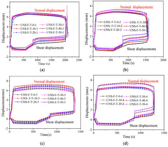 Figure 4. Curves of shear and normal displacements versus time in the DSTUNS: (a) 1 MPa/min, (b) 2 MPa/min, (c) 3 MPa/min, and (d) 4 MPa/min.