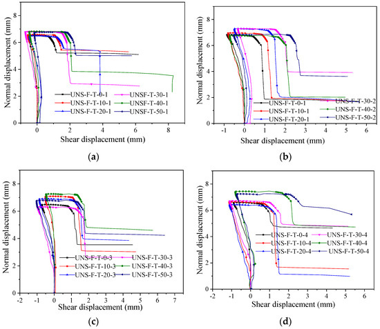 Figure 5. Curves of normal displacement versus shear displacement in the DSTUNS: (a) 1 MPa/min, (b) 2 MPa/min, (c) 3 MPa/min, and (d) 4 MPa/min.