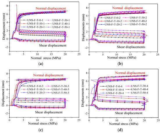 Figure 6. Curves of the shear and normal displacements versus normal stress in the DSTUNS: (a) 1 MPa/min, (b) 2 MPa/min, (c) 3 MPa/min, and (d) 4 MPa/min.