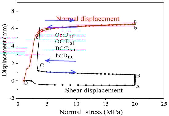 The typical curve of the shear and normal displacements versus the normal stress can be simplified as shown in Figure 7. For example, point A and point a represent normal displacements and shear displacements at the same time, respectively. The normal displacement curve was O-a-b-c, and the shear displacement curve was O-A-B-C. When the normal stress was loaded, the normal displacement gradually changed from point o to point a, and the shear stress gradually changed from point O to point A. During the application of shear stress, the normal stress changed from point a to point b, and the shear displacement changed from point A to point B. During the process of unloading normal stress, the normal displacement changed from point b to point c, and the shear displacement changed from point B to point C.