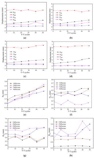 Figure 8 shows the change in the Dsf, Dnf, Dnu, and Dsu with the number of freezing–thawing cycles and unloading rate. Overall, the Dsf exhibited an obvious increase as the number of freezing–thawing cycles increased. However, Dnf, Dsu, and Dnu did not show significant changes as the number of freezing–thawing cycles and unloading rate rose, as shown in Figure 8a–d. The main reason was that the deformation energy was consumed by freezing–thawing cycle damage. Furthermore, the values of Dnf were much bigger than those of Dsu and Dnu, which were kept at a low level. The unloading shear fracture was a transient fracture during the DSTUNS, resulting in a little accumulation of the unloading displacement.