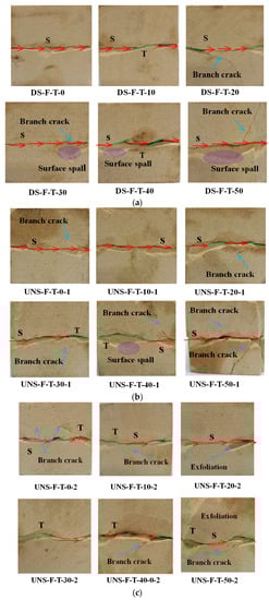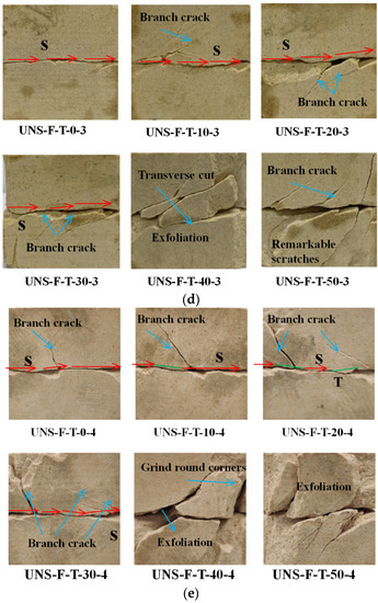Most of the cracks formed in the DSTUNS and direct shear test were uneven and S-shaped. The S-shaped cracks were not obvious in some direct shear tests (Figure 9a). However, they were particularly obvious in the DSTUNS (Figure 9c). Moreover, in the DSTUNS, all the samples showed evident surface exfoliation around the primary cracks (Figure 9b–e).