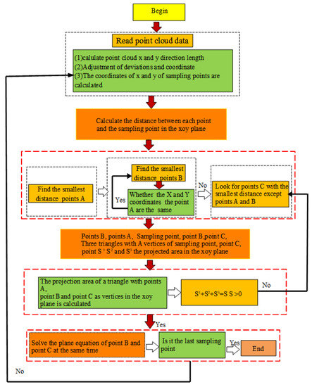 The point cloud was obtained when scanning the rock fracture surface by a Cronos three-dimensional optical scanner. It was necessary to calculate the spatial parameters of the triangular element by the coordinates of the points of adjacent rows and columns in the process of 3D roughness parameter calculation, but the point cloud could not be realized in the calculation process. As a result, it was necessary to triangulate the point cloud through MATLAB program language. Then, the effect of tensile stress on fracture surface roughness was analyzed. The schematic diagram of triangulated point cloud treatment is shown in Figure 10 [60]. Based on the MATLAB program language, the flow chart of calculating the 3D roughness parameters of the rock fracture surface was plotted in Figure 11.