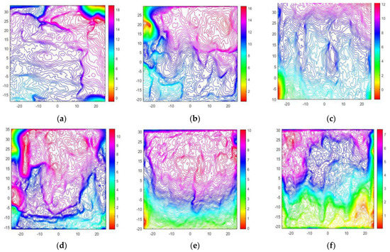 Figure 13. Isopleths of the fracture surface under the 4 MPa/min unloading rate. (a) UNS-F-T-50-4, (b) UNS-F-T-40-4, (c) UNS-F-T-30-4, (d) UNS-F-T-20-4, (e) UNS-F-T-10-4, and (f) UNS-F-T-0-4.