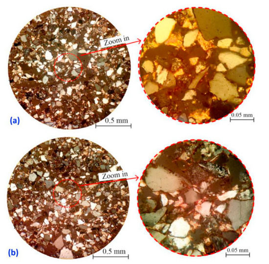 Figure 14. Microscopic images of Wuding sandstone: (a) before freezing and (b) after freezing [58].