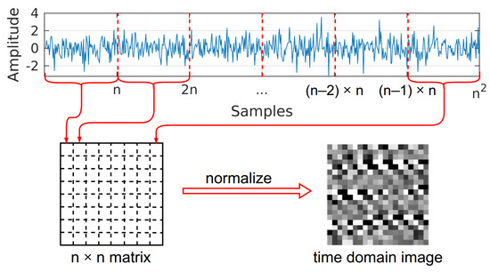The normalized sample is placed at the row , column of the matrix. The corresponding time domain image consists of pixels that are normalized samples of the corresponding signal, as shown in Figure 1.