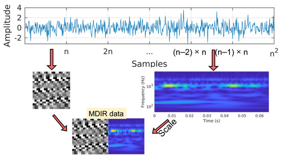 The vibration signal will be transformed into a time-domain image by a simple method proposed by D. Nguyen et al. in [32]. Consider a signal with the number of samples is , all the samples in the signal are rearranged into a square matrix with a size of as follows:
