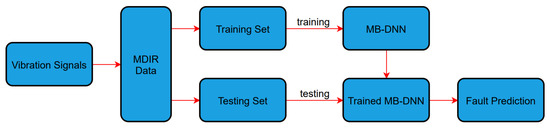 Using the MDIR data and MB-DNN, the proposed fault diagnosis method is illustrated in Figure 5. As shown in the diagram, the original fault signals are transformed into MDIR data. Then the obtained dataset is split into a training set and a testing set. The MB-DNN is trained with the training set by the back-propagation algorithm. Using the stochastic gradient descent with momentum, the weights of MB-DNN are updated by the equations