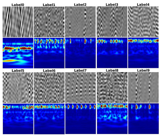 The time-frequency domain image conversion exploits CWT using the Morse wavelet function. To deal with the time-frequency domain image, the obtained time-frequency images are scaled to a size of . The MDIR data of the vibration signals with ten labels were obtained as shown in Figure 8.