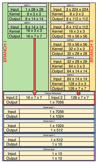 As shown in Figure 4, the proposed MB-DNN has two branches. While branch I handles the time domain images, branch II handles the time-frequency domain images of the vibration signals. Each branch consists of several CBP modules. Two branches simultaneously extract features from the input MDIR data, generate two types of feature maps. After that, the feature fusing layer will fuse these feature maps to generate a single one and forward it to the next part of the network. The operation of the feature fusing layer is described as follows:
