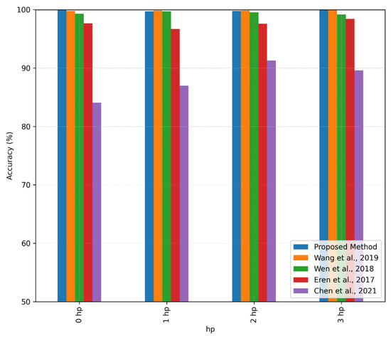 The accuracy of all methods is shown in Figure 10. It can be observed that in all cases of load conditions, the proposed method and the Alexnet-based method in [25] achieve the best performance. The two methods have high mean accuracy and small standard deviation. The Lenet5-based method in [24] has a little lower accuracy. The CNN1D-based method in [26] has a lower performance with low accuracy. The CNN1D-based method in [42] has the poorest performance with low accuracy.