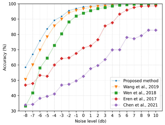 In the previous section, all compared methods achieved very high diagnostic accuracy when the inputs were the original signals. When the input signals were transformed by adding low-level noisy signals with the SNR in the range of [0, …, 10], the performance of the method in [26,42] was significantly reduced, but the performance of the proposed algorithm and the methods in [24,25] were reduced insignificantly; however, when the input signals are transformed by adding high-level noisy signals with the SNR in the range of [−8, …, −1], their performance decreases dramatically. Obviously, the noise makes it harder to extract fault signatures from the signals. It can be observed that in the worst case (−8 dB), the methods in [24,26,42] totally fail since their accuracy is under 50%. The trend of all methods’ performance is, the higher the noise level, the lower the accuracy of the diagnosis result. Among all methods, the proposed one achieves the best performance with good robustness against noise. Even under the worst noise case (−8 dB), it achieves an accuracy of 57%. Comparing the structures of all methods, we can see that the method in [25] only takes care of the time-frequency domain features; the methods in [24,26,42] only consider the time domain features. The difference of the proposed methods is that they can receive multiple feature domains. As a result, the proposed method can extract more robust features from signals in noise conditions. So, it can be concluded that the proposed network with a multi-branch deep structure can extract fault features more effectively even under severe noise conditions. That leads to better diagnostic performance compared to other DNNs.