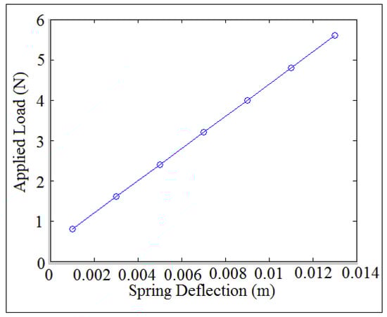 An internal distance of the follower guide (I.D. = 16 mm) with different cam speeds was used in the experiment test. The internal dimension of the follower guide refers to the size of the follower guide from the inside, meaning the distance between the two halves of the cylindrical shape of the follower guide. There was a link between the two halves of the cylindrical shape. The internal distance of the follower guide from the inside was measured to be (I.D. = 16 mm) because it is constant from the manufacturer. The experimental setup was carried out through a high speed camera at the foreground of OPTOTRAK 30/20 equipment to catch the follower position and to determine the contact force. Multi-degrees of freedom (spring-damper-mass) system was used at the very end of the follower stem to keep both cam and follower in permanent contact and to reduce the detachment heights of the follower. All the springs have the stiffness (K1= K2 = K3 = K4 = K5 = 73.56 N/mm) while the coefficient of the damping have the values (C1 = C2 = C3 = C4 = C5 = 9.19 N·s/mm). The masses of the four boxes were (M1 = M2 = M3 = M4 = 0.2625 Kg, Mtotal = 1.05 Kg) to reduce the peak of follower displacement of the lift position. The follower moves with three degrees of freedom in which the contact point was considered in the calculation of follower displacement. The signal of follower movement was derived once and twice to determine the follower acceleration. After multiplying the follower acceleration by the follower mass using Newton’s second law of dynamic motion, the contact force can be experimentally determined []. Figure 1 shows the experiment test. Due to the interface feedback of an infrared 3-D camera of the OPTOTRAK / 3020 device, the follower movement was stocked in an Excel file. The follower displacement was processed using MatLab software. To retain the contact between the cam and the follower, a spring with the specification [] such as spring index (C = 3), number of turn (n = 6), modulus of rigidity (G = 80 GPa.), coil diameter (d = 2.5 mm), outside diameter (OD = 10 mm) and preload extension (Δ = 15 mm) had been used between the vertical table and follower stem. The spring was suspended from a fixed point, and the load was applied at the very end point of the spring. The spring deflection was recorded against the applied load, [] in which the slope represented the spring stiffness (K = 400 N/m) as indicated in Figure 2.