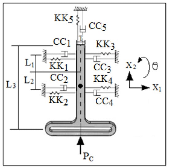 In this paper, the nonlinear dynamics phenomenon occurred due to the motion of the follower with three degrees of freedom (right-left, up-down, and rotation about z-axis). Newton’s second law of the dynamic motion was applied to describe the three degrees of freedom of the follower. Figure 4 showed the mechanical vibration representation of the three degrees of freedom system for the flat-faced follower and its guide. All the springs have the stiffness (KK1 = KK2 = KK3 = KK4 = KK5 = 73.56 N/mm) while the coefficients of the damping have the values (CC1 = CC2 = CC3 = CC4 = CC5 = 9.19 Ns/mm). The mass of the follower was (m = 0.2759 Kg). The cam follower mechanism can be treated as a single or multi-degrees of freedom based on the motion of the follower, []. The impedance matrix can be put into terms of frequency response matrix, []. The contact force expression in terms of the pressure angle has been taken from, [,]. The equations of motion with the solution can be seen in Appendix A.
