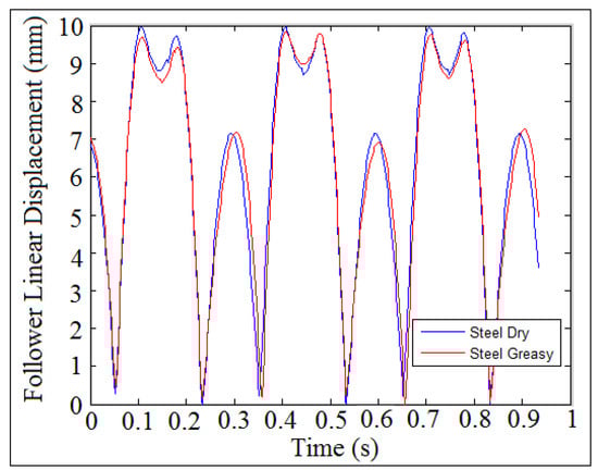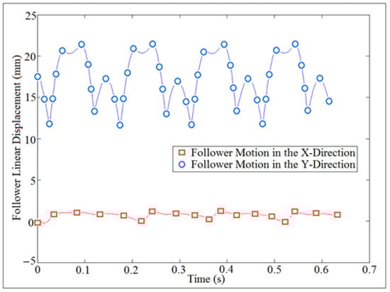 As stated earlier, the follower moved with three degrees of freedom because of the clearance between the follower and its guide. The variation of nonlinear response of the follower displacement was intangible in the x-direction while there was a variation in the y-direction for the follower displacement as indicated in Figure 7.