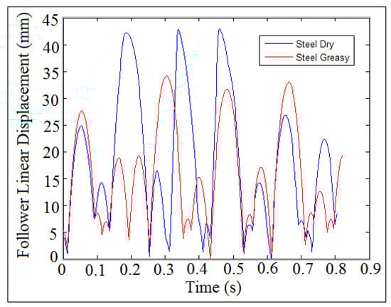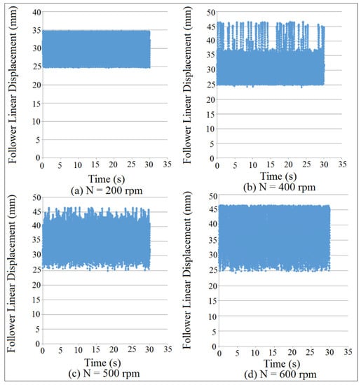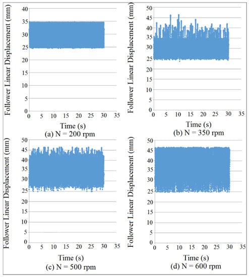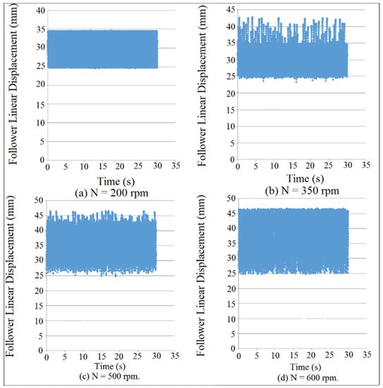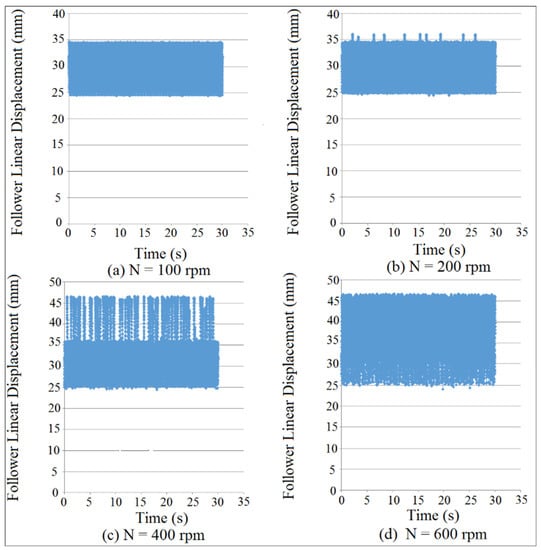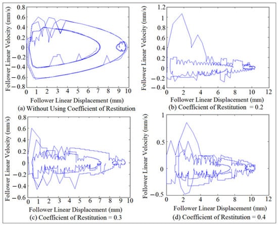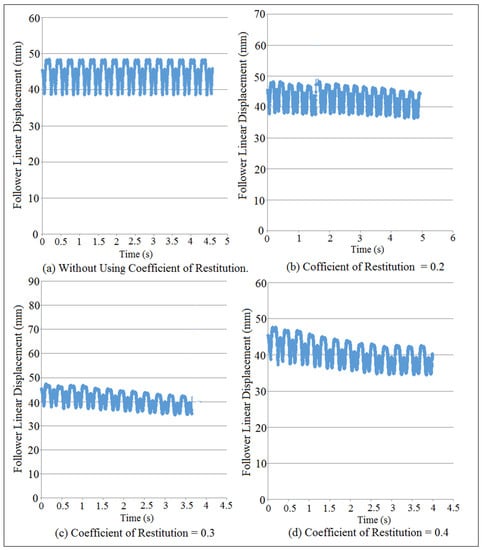 Figure 11 showed the follower displacement mapping against time at different coefficient of restitution values for (I.D. = 19 mm) and (N = 200 rpm). SolidWorks program was used in the simulation of follower displacement. Coefficient of restitution induces impact and is defined as a loss in potential energy due the reduction in the peak of nonlinear response of the follower. There were no losses in potential energy when the cam and the follower were in permanent contact as indicated in Figure 11a. The potential energy losses were increased with the increasing of coefficient of restitution due to the impact until the peak of nonlinear response of the follower displacement settles down as shown in Figure 11b–d. In general, when both the cam and follower are in permanent contact, it means there was no loss in potential energy and there was no either impact or coefficient of restitution. The detachment between the cam and the follower was increased with the increasing of the coefficient of restitution in the presence of the impact.