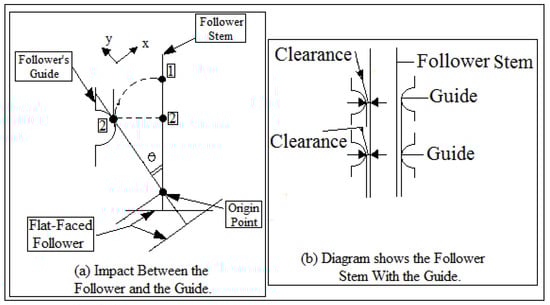 (a) Impact between the follower and the guide. (b) Diagram shows the follower stem with the guide.
