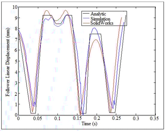 In this paper, the cam profile with return-dwell-rise-dwell-return-dwell-rise-dwell-return-dwell-rise-dwell was selected, []. The system with (I.D. = 16 mm) and (N = 200 rpm) was used in the verification of the follower displacement as shown in Figure 12 for one cycle of cam rotation.