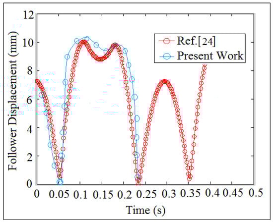 The analytic follower displacement was done by applying Equation (A13). Follower linear displacement was tracked experimentally through high speed camera at the foreground of OPTOTRAK/3020 equipment. Solidworks program was used in the numerical simulation of follower linear displacement. In the analytic solution of the follower displacement, the dwell stroke period of time was a straight line, which means that there was no detachment between the cam and the follower. In the numerical simulation, the dwell stroke was divided between the rise and return strokes and the detachment was intangible between the cam and the follower. In the experiment setup, the dwell stroke was tangible and it was varied sinusoidal against time. Regarding the comparison of the present work with the other publications, Figure 13 showed the comparison of nonlinear response of the follower against time. In the present work, the system with (I.D. = 17 mm) and (N = 200 rpm) was considered in the simulation using SolidWorks program. The author in Ref. [] used six orders of piecewise polynomials for smoothing the motion curve of flat-faced follower due to the contact with a polydyne cam.