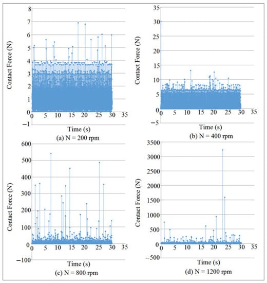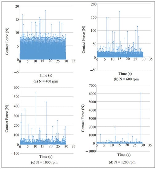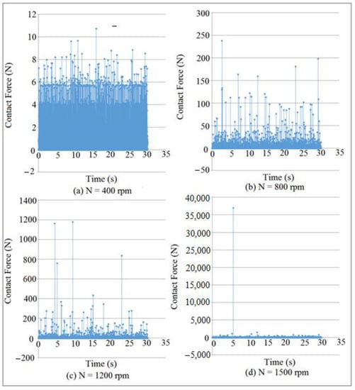 Contact force mapping against time at different cam speeds for (I.D. = 16 mm).