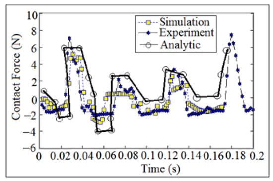 Figure 16 showed the comparison of the contact force against time at (I.D. = 16 mm) and (N = 200 mm). The analytic set of data of the contact force was calculated after applying Equation (A12), while the numerical simulation of the contact force was determined using SolidWoks program. The experimental set of data of the contact force was calculated after tracking the follower position using high speed camera at the foreground of the OPTOTRAK 30/20 equipment. Newton’s second law of dynamic motion was applied once and twice in the presence of follower mass and follower acceleration as mentioned earlier in (Experiment Test) section. In high speeds of the cam, it is important to produce a maximum acceleration which gives a negative value of the contact force. The follower acceleration is positive when the radius of curvature of the contact of the follower with the cam profile is positive and vice versa, []. Based on the above, the detachment between the cam and follower decreases when the follower decelerates at negative value for the contact force, especially at high speeds of the cam.