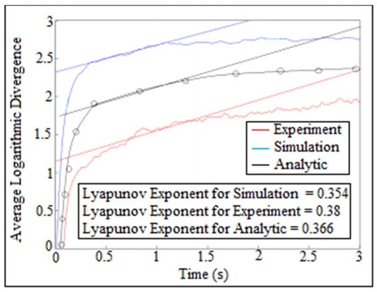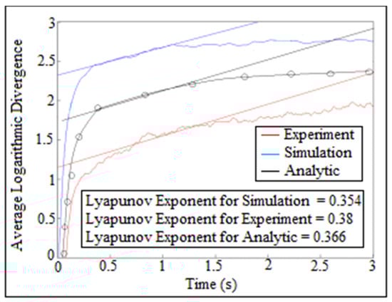 There was another way for estimating largest Lyapunov exponent of the contact force which was called average logarithmic divergence. The straight line represented the slope of average logarithmic divergence which reflected the value of Lyapunov exponent parameter. The curve represented the logarithm function against time of the contact force. As is known, the logarithm function treats any set of data by a straight line which gives the value of largest Lyapunov exponent. Figure 23 showed the comparison of average logarithmic divergence of contact force against time for (I.D. = 16 mm) and (N = 200 rpm). The analytic largest Lyapunov exponent of the contact force was calculated after applying Equation (A13) on one column of the contact force using average logarithmic divergence approach, while the numerical simulation of the largest Lyapunov exponent of the contact force was determined using SolidWoks program. The experiment value of largest Lyapunov exponent had been obtained after tracking the follower position using OPTOTRAK 30/20 equipment through high speed camera and by applying Newton’s second law of dynamic motion on the follower mass and follower acceleration as mentioned in (Experiment Test) section.
