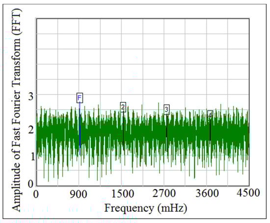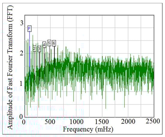 Power density function was used to detect the detachment between the cam and the follower because it gives six frequency peaks’ alongside with the fundamental frequency. []. The fundamental frequency has the letter (F), while the other frequencies’ peaks have the numbers (2, 3, 4, 5, 6) in (FFT) diagram. The peaks of the fundamental frequency and the other frequencies’ peaks refers to periodic motion (the contact force was in maximum value and there was no detachment between the cam and the follower). When the frequencies’ peaks have been started disappearing from (FFT) diagram, the motion is non-periodic (the contact force is approaching zero and the detachment between the cam and the follower is occurred). Figure 24 and Figure 25 showed the comparison of power spectrum analysis of Fast Fourier Transform (FFT) at (I.D. = 17 mm) and (N = 200 rpm). The numerical simulation values of the contact force was calculated using SolidWorks program, and after that, the one column of contact force was treated using (FFT). The experiment data of the follower displacement was tracked using OPTOTRAK 30/20 equipment through high speed camera and Newton’s second law of dynamic motion was applied based on the values of follower mass and acceleration to determine one column of the contact force. One column of the contact force was treated using (FFT). It can be concluded from Figure 24 and Figure 25 that there was no detachment between the cam and the follower because the six frequency peaks had not been disappeared from (FFT) diagram.